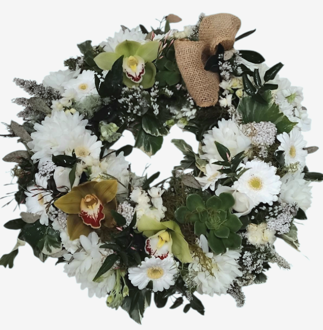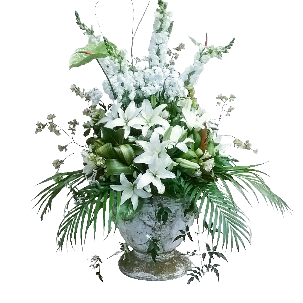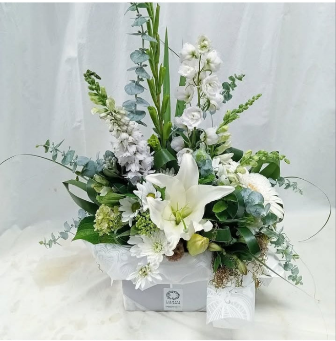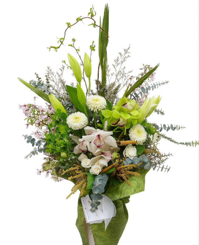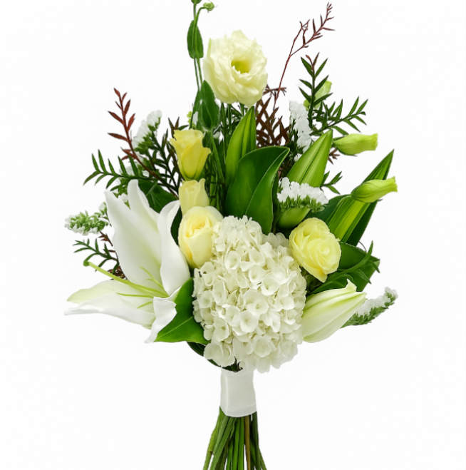 White and ivory flowers shine in arrangements that are elegant and creative. This bouquet will be uniquely made using seasonal flowers fresh from the market. Seasonal foliage will also be use and lovingly hand wrapped for its safe arrival.