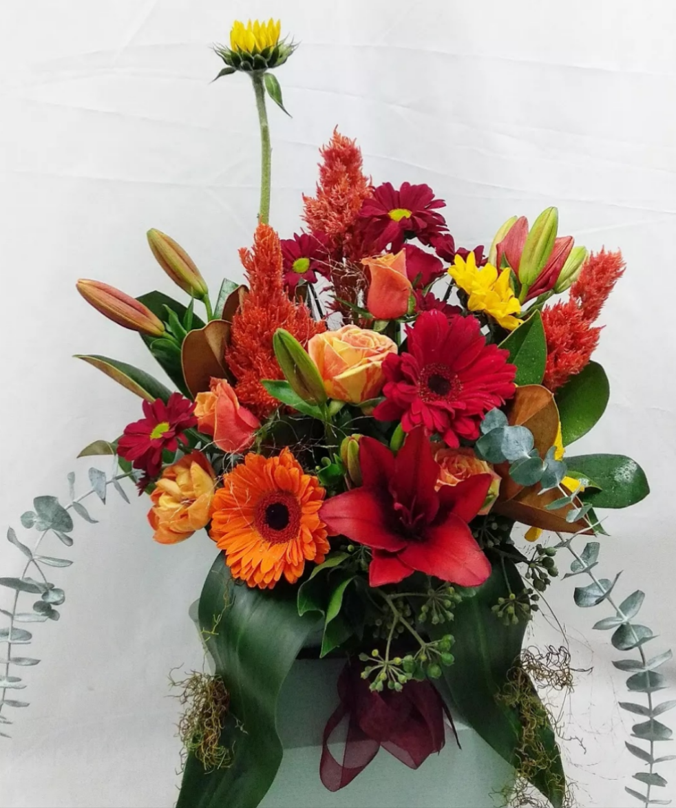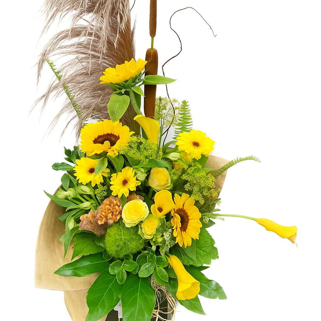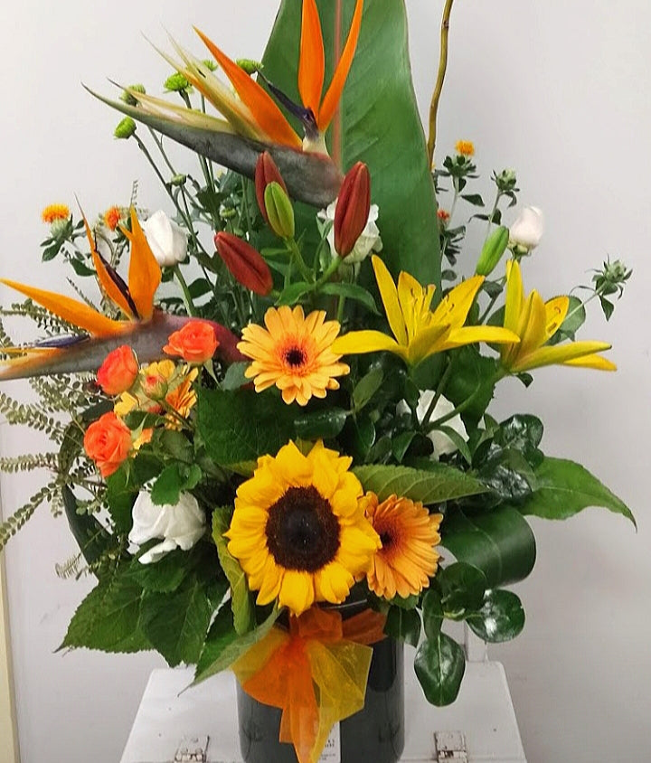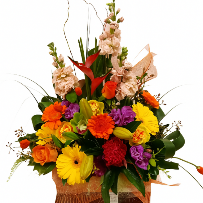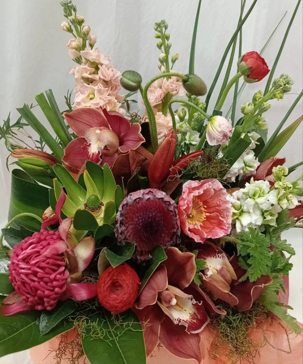 This vibrant and lush tropical bouquet would look lovely in any home or office. It will be uniquely made to order with seasonal flowers in these bright tones. It will also include foliage that is currently in season and carefully wrapped to ensure a safe delivery. We can also wrap this in a flax mat for that more Pacific feel.