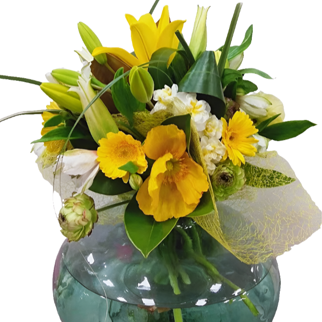 A selection of seasonal cheery yellow flowers made to order fresh from the flower market. This bunch is bound to brighten up anyone's day. Also includes seasonal foliage and lovingly wrapped to ensure a safe delivery to its new home.